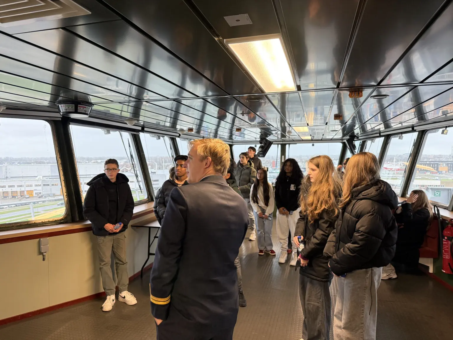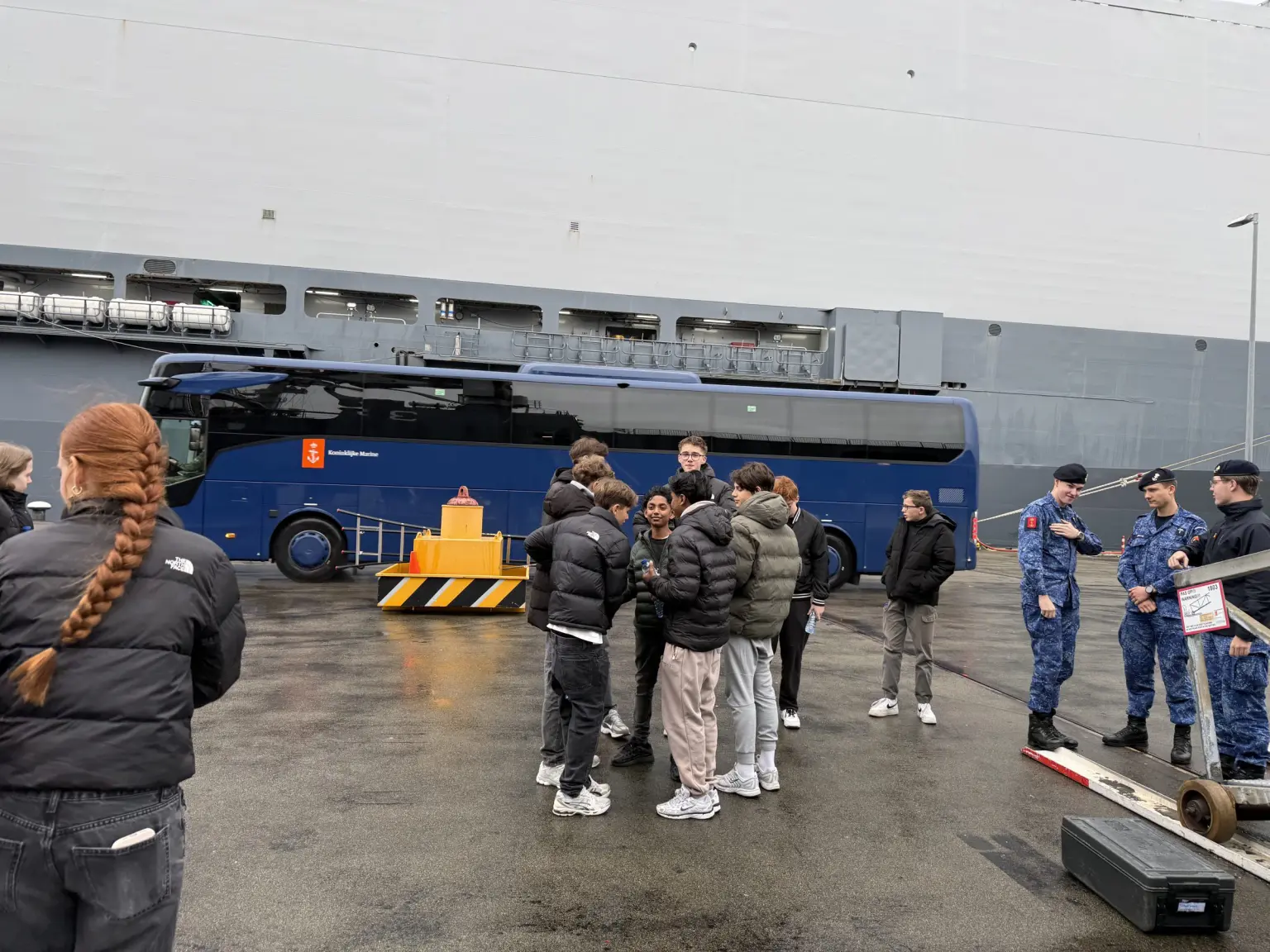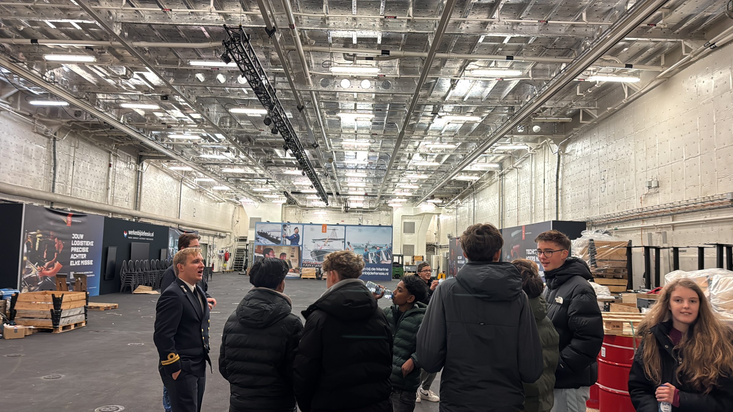 In de middag maakten de leerlingen kennis met het studentenleven van de adelborsten — van wonen en sporten tot de vraag of je werkelijk salaris ontvangt tijdens de opleiding. Het bezoek eindigde met een rondleiding aan boord van Zr.Ms. Karel Doorman. Daar werd pas echt duidelijk hoe indrukwekkend groot een marineschip is; sommige leerlingen raakten zelfs even de weg kwijt in het doolhof van gangen.